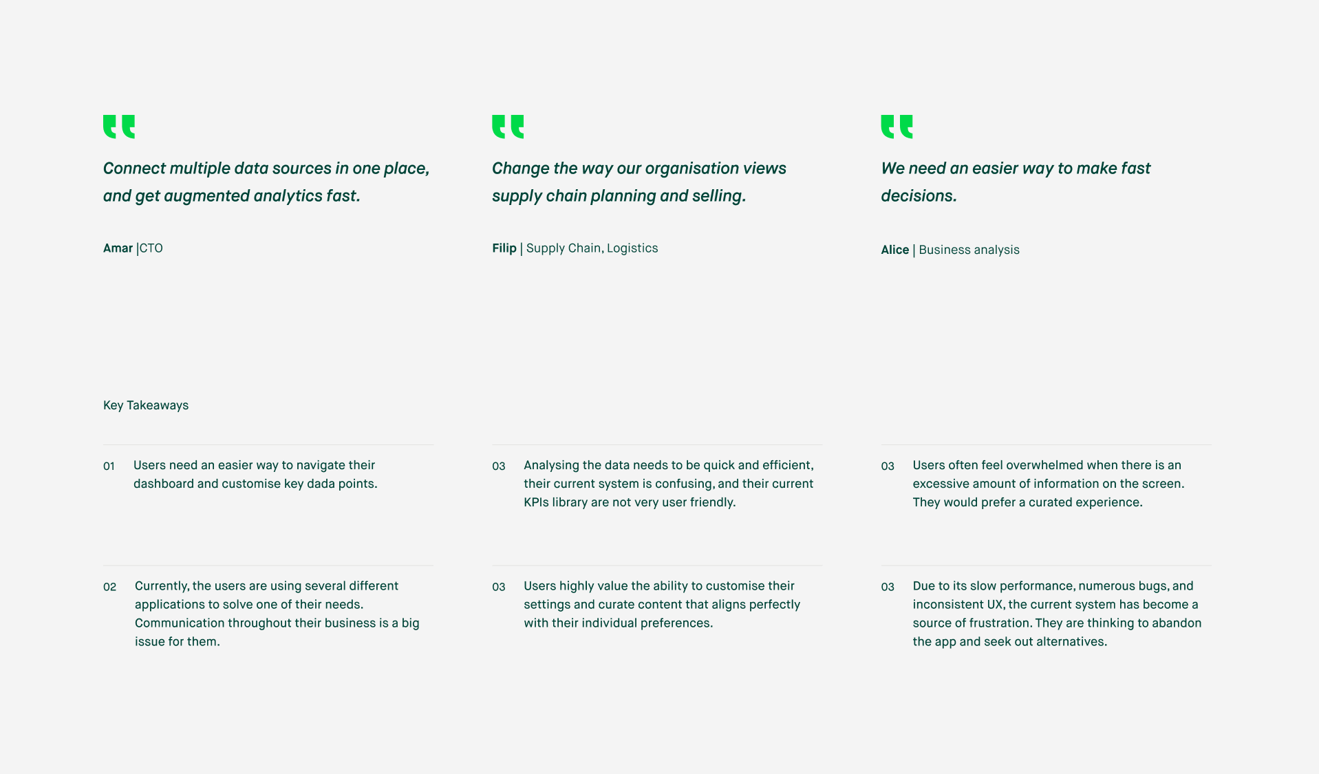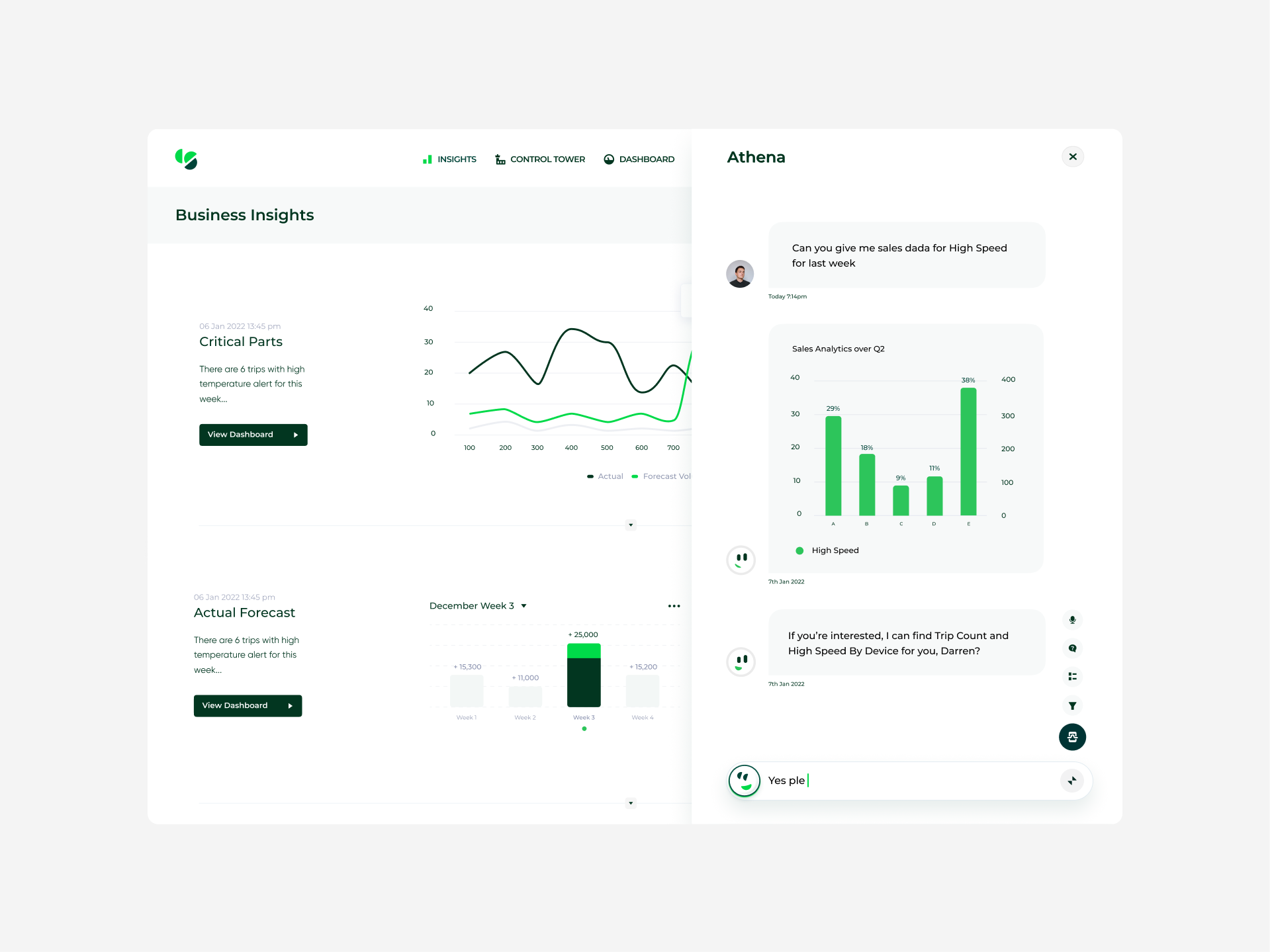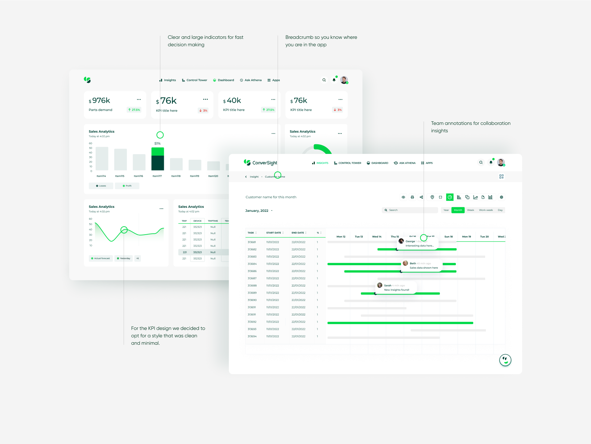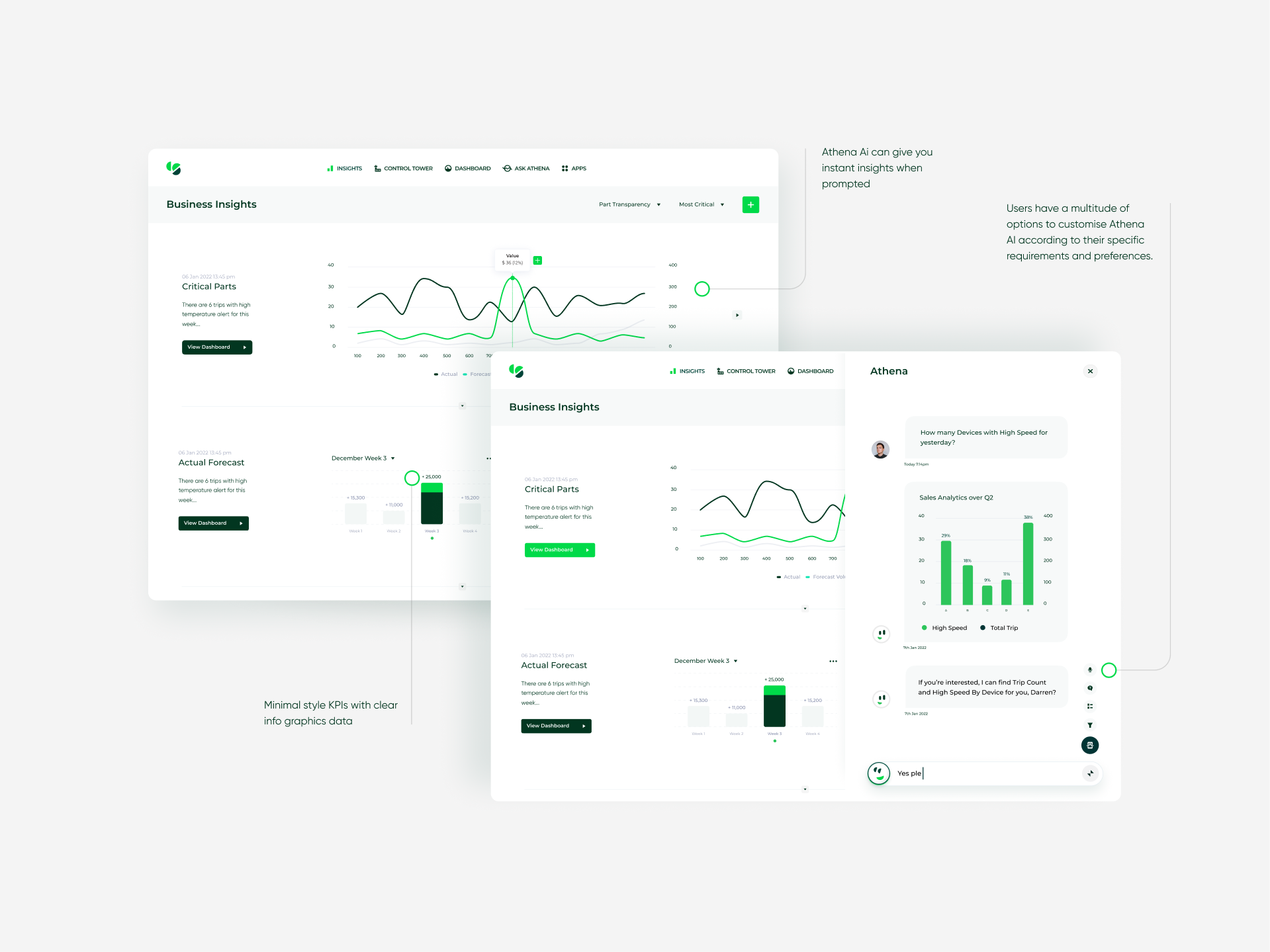 Throughout the discovery process, a major pain point that arises is the lack of clear insights. To address this, I have carefully designed the KPIs in a simple and understandable manner, presenting clear data without overwhelming the users. Moreover, the client is equipped with Athena, which communicates and automatically interprets the data, further enhancing its ease of use.