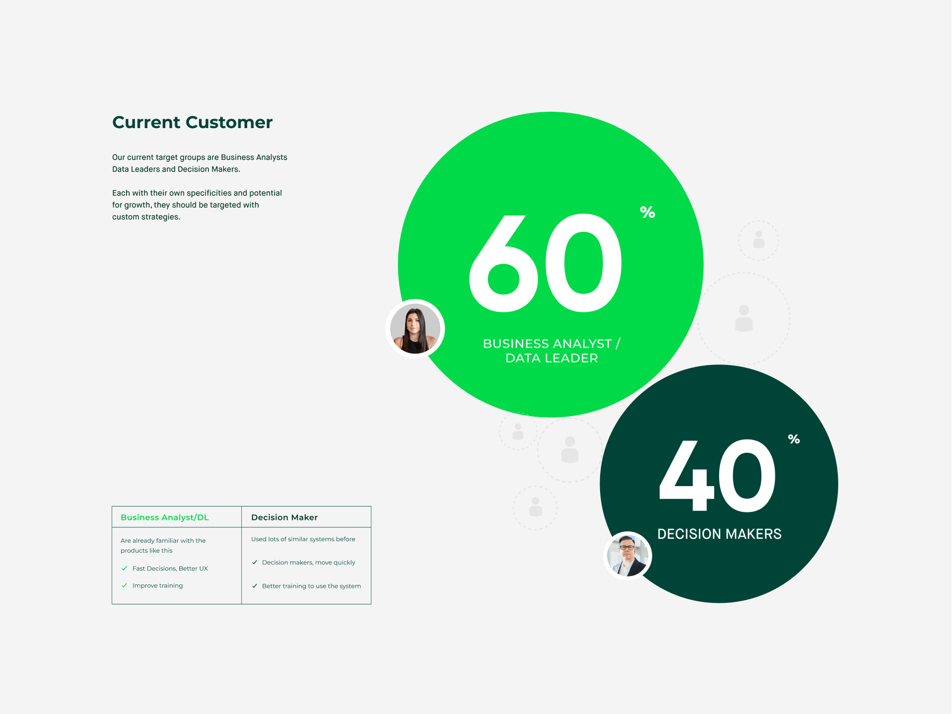 The current target groups are Business Analysts and Tech Leaders, amounting approximately 2/3rds of users, and inexperienced or Decision Maker, which are about 1/3 of users.