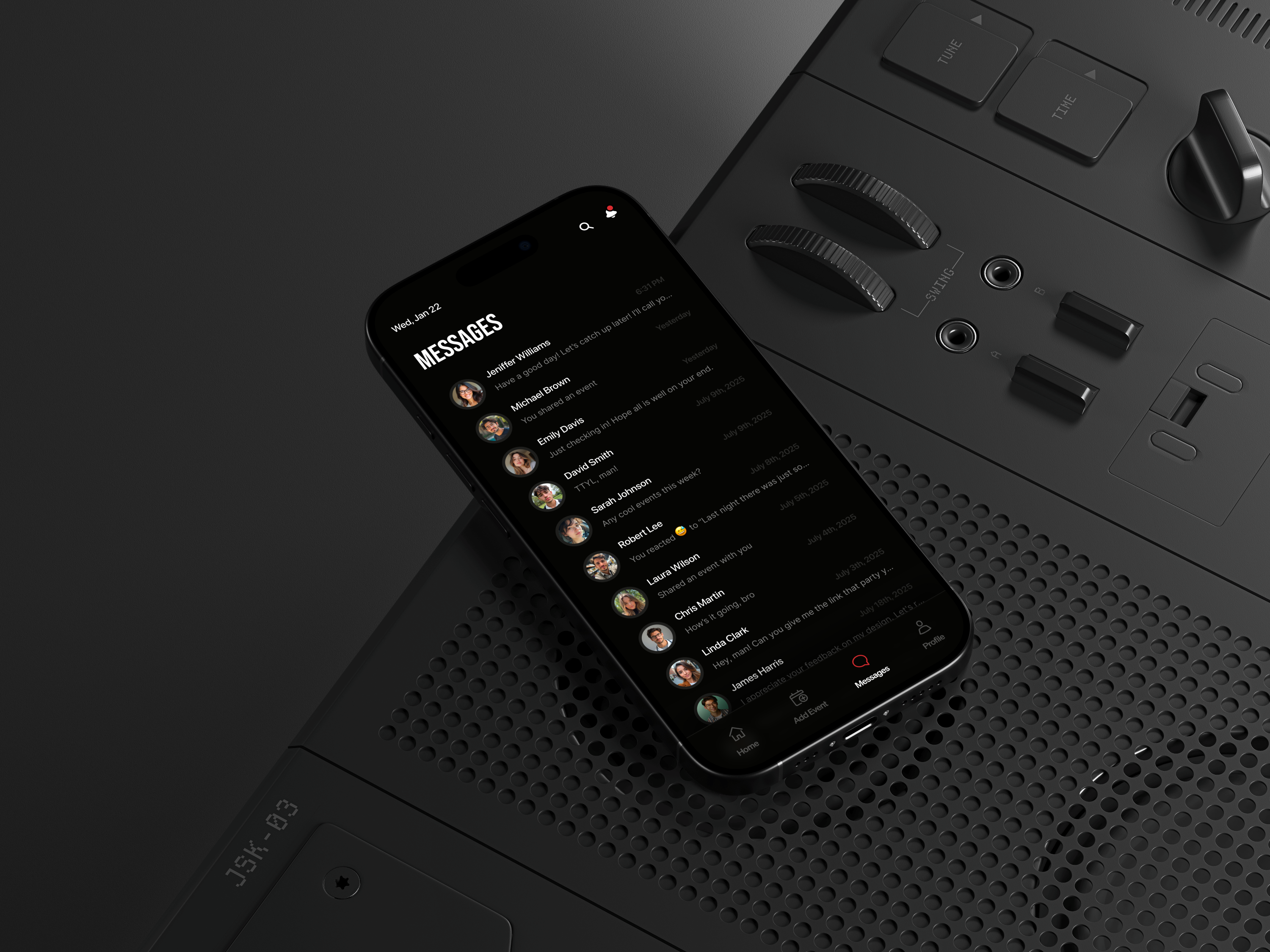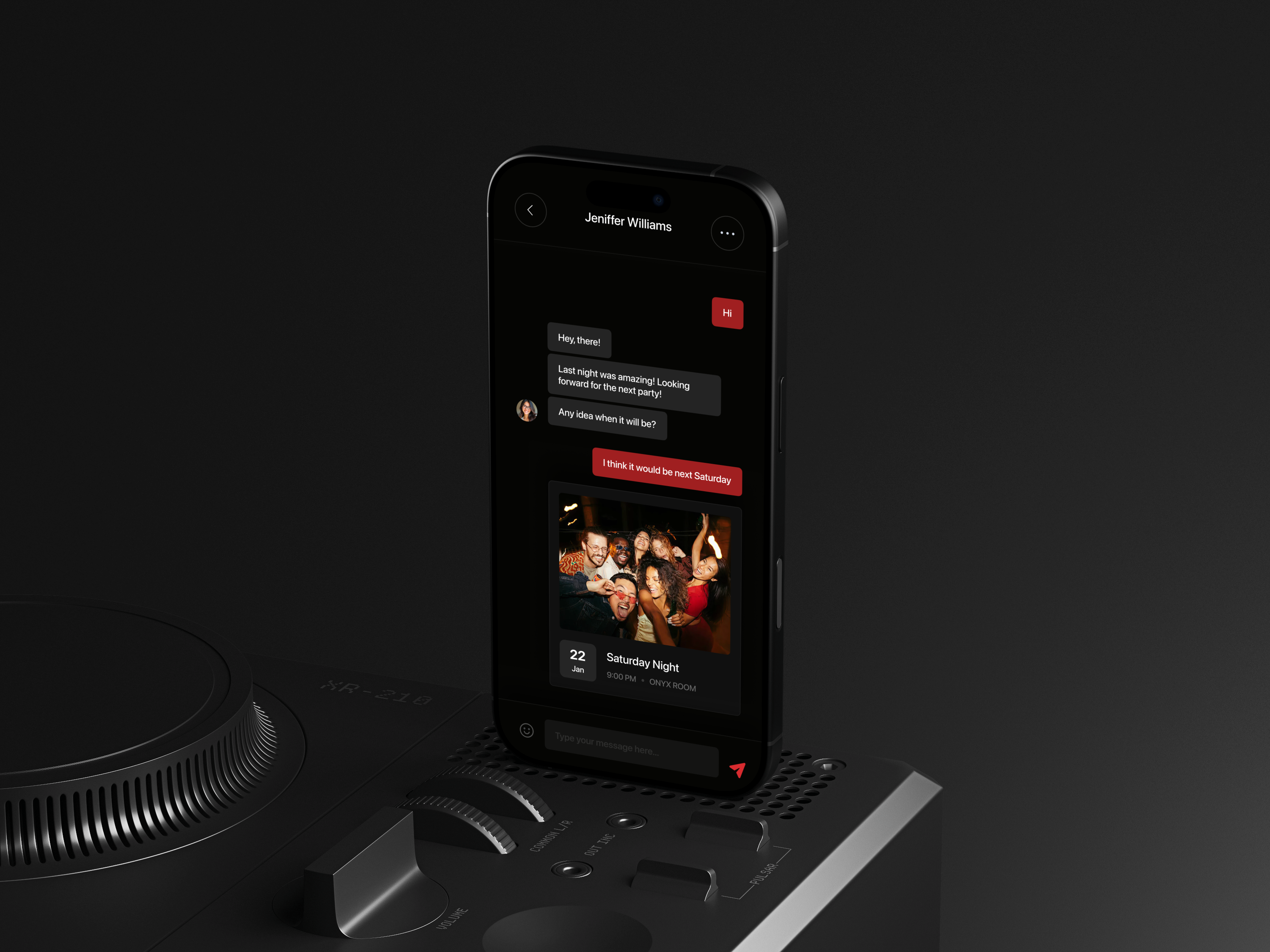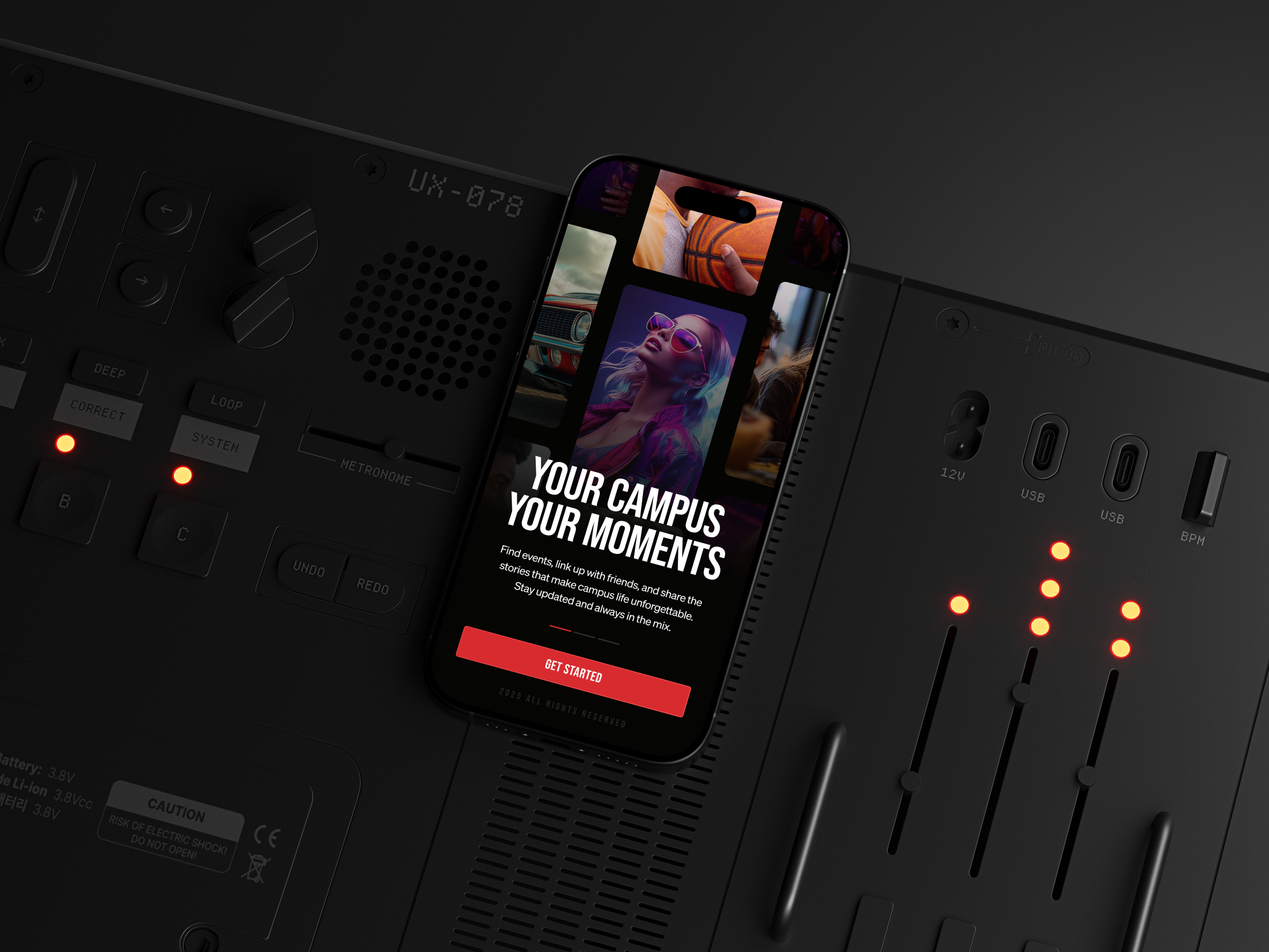 Events, stories, and messaging share consistent patterns (cards, chips, and actions) so users can move between modes without re-learning the UI. The dark theme supports media-first content and fits naturally into nightlife and campus settings.
