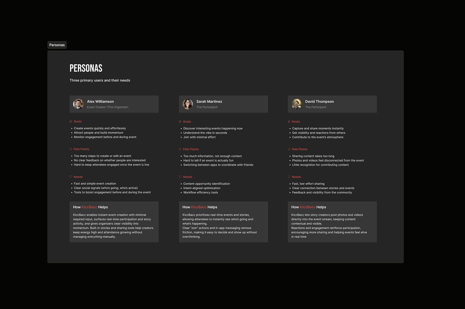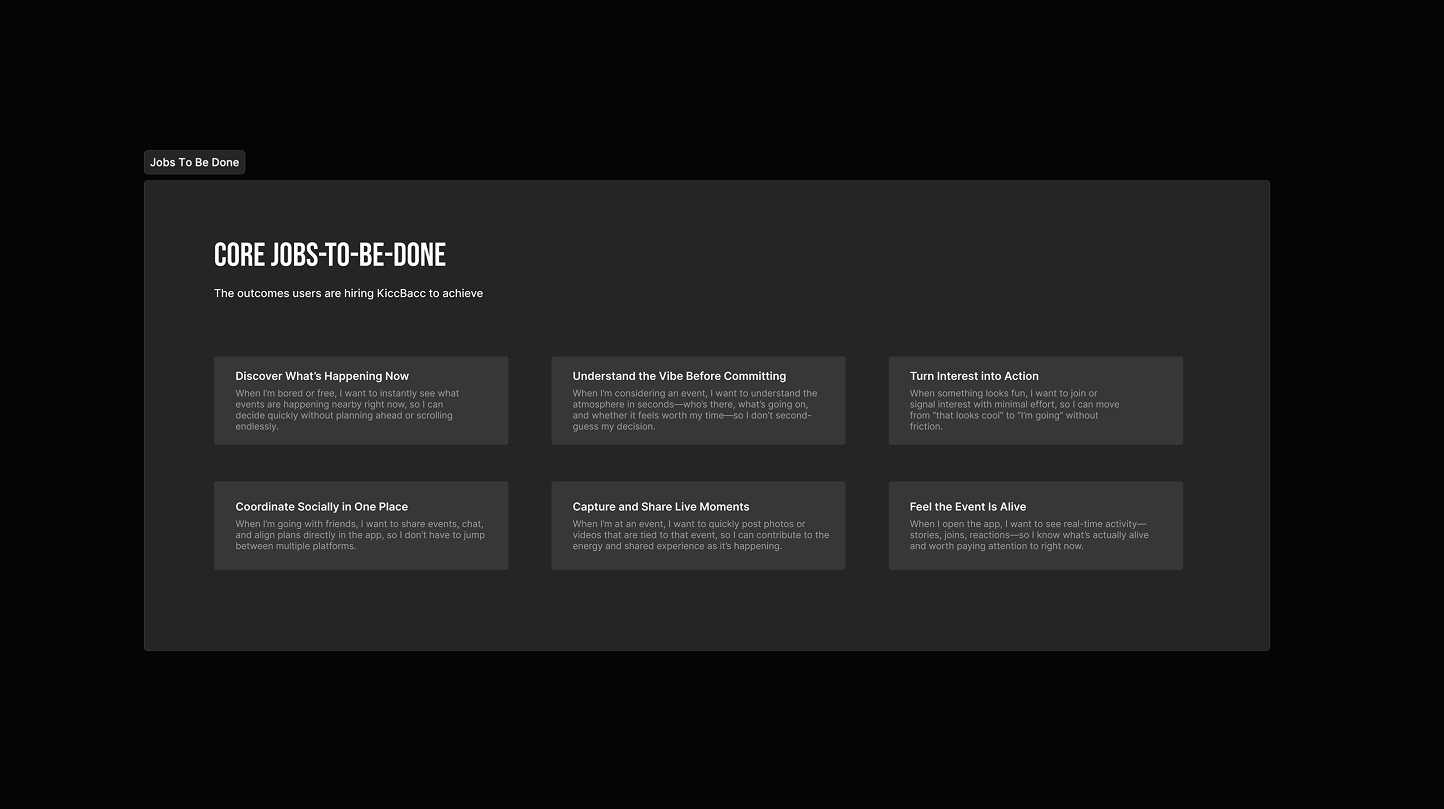 KiccBacc needed clearer social context (who’s going, what’s the vibe), a faster path from discovery to action, and in-app coordination so users don’t have to jump into external chats to make a decision.
